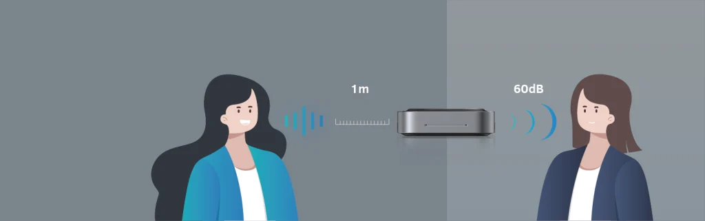 Nhờ sử dụng công nghệ AI khử ồn tiên tiến, loa kèm micro Maxhub BM35 giúp loại bỏ tiếng ồn nền xung quanh. Như tiếng điện thoại, máy quạt, gõ bàn phím, một cách hiệu quả. Đặc biệt là trong phòng họp bằng kính, Maxhub BM35 lọc bỏ tiếng vọng một cách tối ưu nhất. Nâng cao sự tập trung của người tham gia vào cuộc họp. Ngoài ra, với sự kết hợp của công nghệ DOA (Direction of Arrival) có thể xác định vị trí người phát biểu và tập trung độ chính xác vào âm thanh.